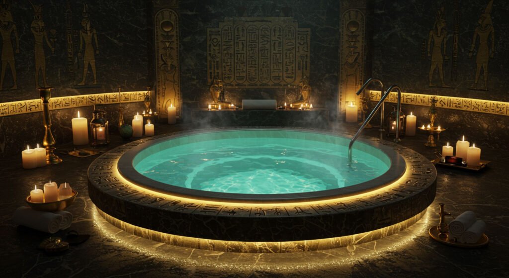 Our thermal bath sanctuary is designed with authentic Egyptian elements and lit by warm candlelight to transport you to a realm of deep relaxation. The glowing turquoise waters are infused with therapeutic minerals that soothe muscles, improve circulation, and rejuvenate your skin.