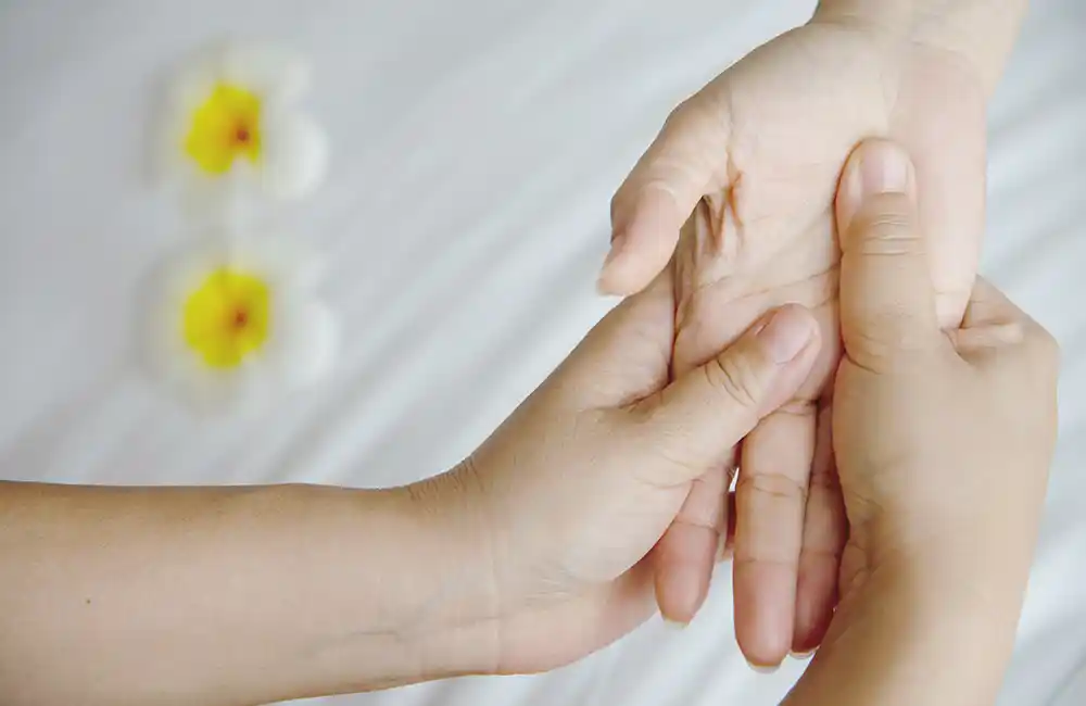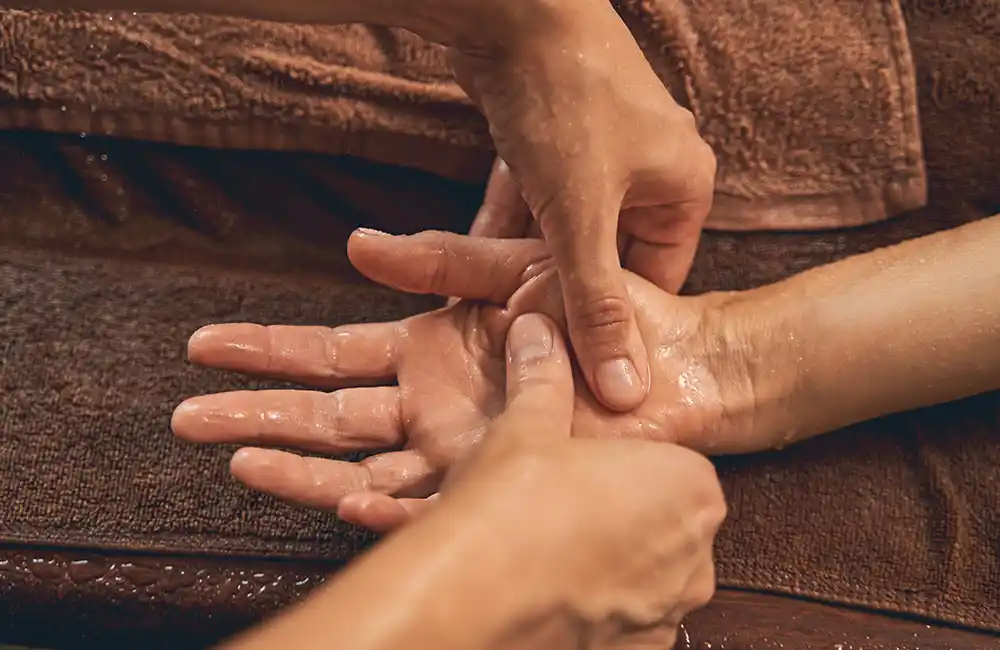 Thumb and finger pressure along reflex areas of palms and fingers to stimulate internal balance and ease tension.
