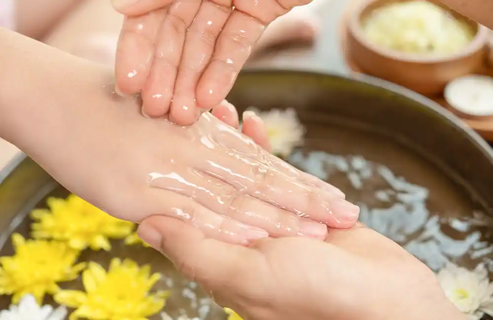 Heated natural oils are gently massaged into hands and feet.